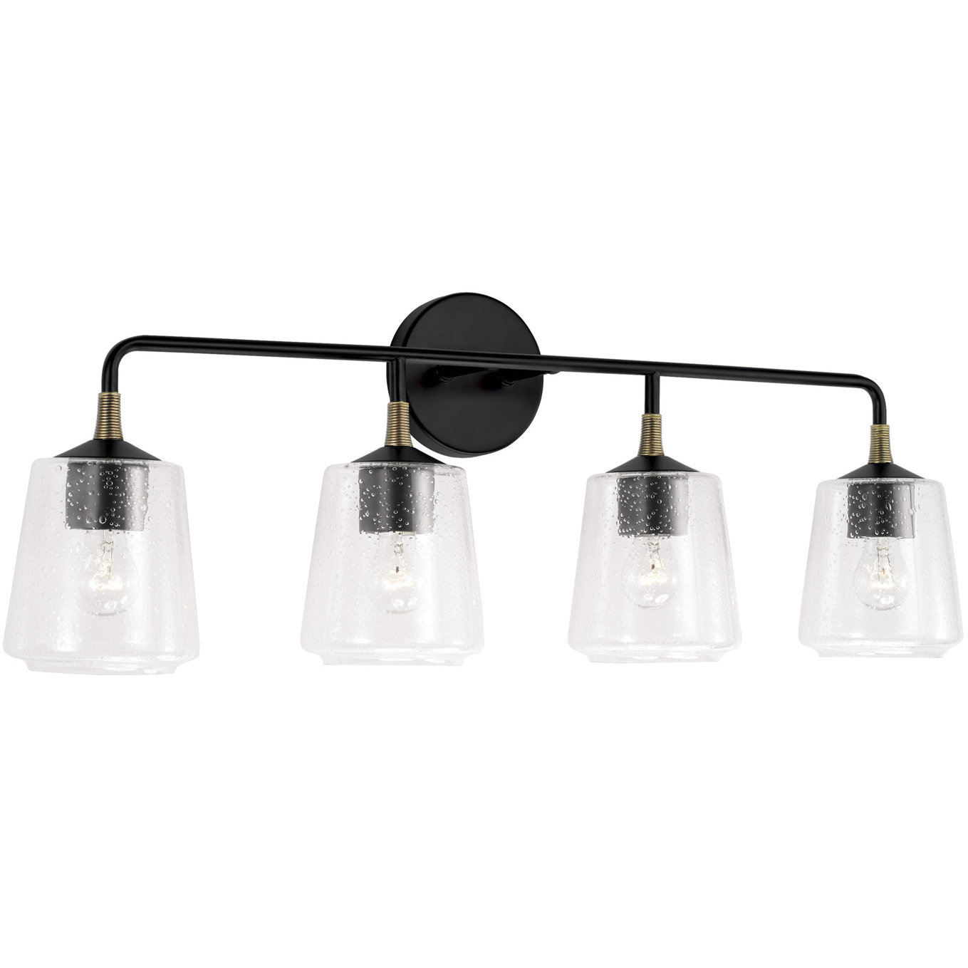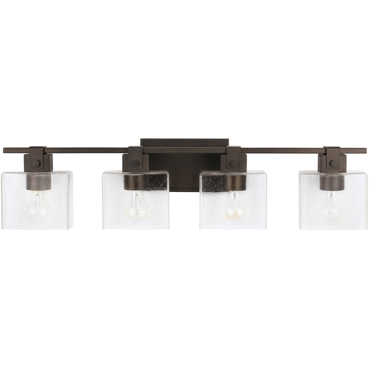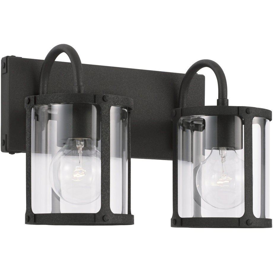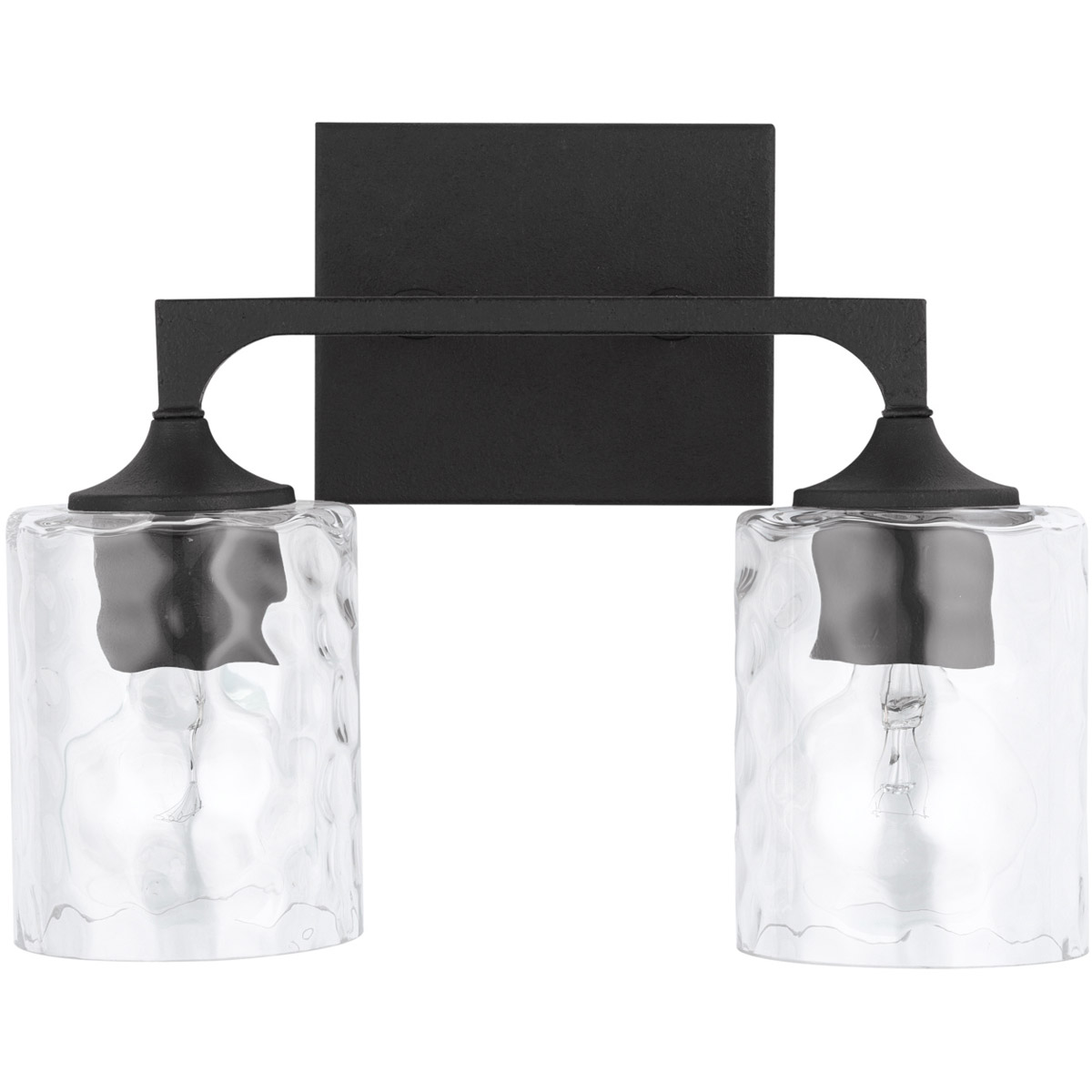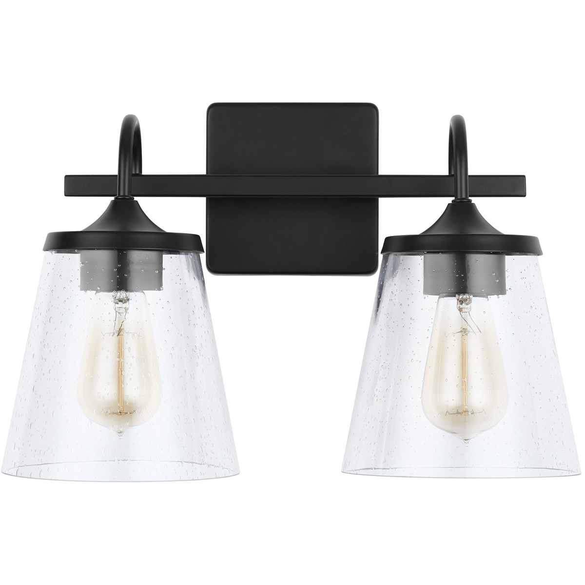 Peyton 3 Light 23 inch Matte Black Vanity Light Wall Light Description The sharp lines and artistic arches of the Peyton 3-Light Vanity are timelessly transitional. The muted tone of the Matte Black finish allows the seeded glass shade to take center stage. This fixture is available as a 2-light or 3-light. Brand Capital Lighting Category Bathroom Vanity Lights Collection Peyton Finish Matte Color Blacks Product Specifications Product Information Brand: Capital Lighting Brand Category: Vanity Light Brand Product Description: 23" 3-Light Vanity in Matte Black with Clear Seeded Glass Shipping Method: Ground SKU: 142031MB-510 UPC: 841740159487 Electrical and Operational Information Lamping Category: Incandescent Lamping Included: Bulbs Not Included Lamping Type: A15 Primary Number of Bulbs: 3 Socket: E26 Medium Total Number of Bulbs: 3 Wattage Max: 100.00 Dimensions and Measurements Backplate/Canopy Extension: 1 Backplate/Canopy Height: 5 Backplate/Canopy Width: 5 Extension: 7.00 Height: 9.75 Maximum Adjustable Height: 9.75 Weight: 5.25 Width: 23 Warranty and Specifications Country of Origin: China Height from Center of Wall Opening: 2.5 Install Position: Socket Up or Down Location Rating: Suitable for Damp Locations Prop 65: Yes UL Ratings: UL Damp Warranty: 1 Year Additional Details Features: Glass Dimensions: H 5.75, W 4.5Center of Backplate to Fixture Bottom: 7Emitted Light Direction: Multiple DirectionsAPPLICATIONS: Rated for damp locations, perfect for bathrooms and powder rooms. Cylindrical seeded glass shades offset the strong matte black arch elements in this classic fixtureEASY TO INSTALL: Replacing an existing fixture is easy with the included instructions and can be finished in as little as 15 minutes with a few simple hand tools. Install with sockets opening either upward or downward.VERSATILE: Mounts bulbs up or down, dimmable and LED/CFL/Incandescent compatible, uses three 100-Watt (max) E26 medium base bulbs (Not Included) Glass Features: Clear Seeded Material: Metal/Glass